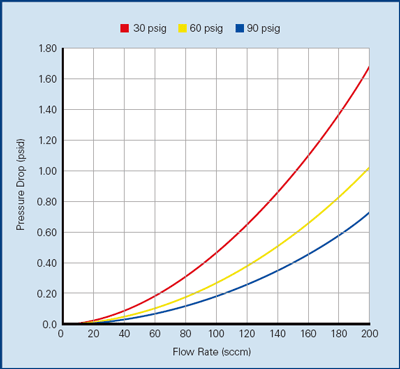 Pressure drop curve for the PS2-GC50-R (in Argon) at various inlet pressure levels (30, 60, and 90 psi):