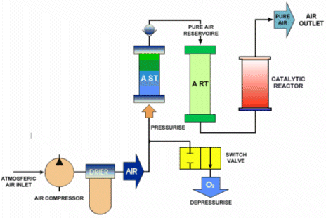 The generator AG 2301 is based on the PSA (Pressure Swing Adsorption) principle. The pure air is generated by compressing ambient into a Carbon Sieve Bed (CMS).