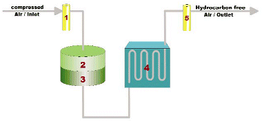 an autodrain. The air is passed over a low power heater element (2) before coming into contact with the catalytic
